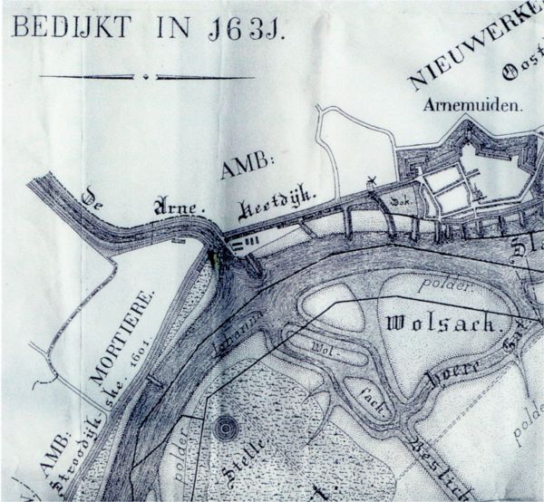 De inpolderingen van de rede van Arnemuiden. Op deze tekening zijn de Middelburgse Polder en de Johanna Polder te zien. Door de vernauwde Slaak kunnen kleine schepen bij de zoutketen komen.
