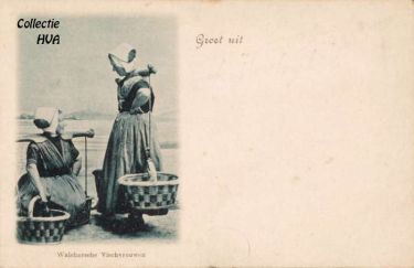 De vrouwen en ook sommige mannen houden zich onledig met het rontventen der waar door Walcheren en naburige eilanden. Maken we even kennis met dit eigenaardig volkje. Ziet, daarginds komt één dier vischvrouwtjes aanstappen. Haar kleding gelijkt op die der Walcherse dorpsbewoners, maar is er van onderscheiden door eene vrij groote mate van slordigheid, die echter, door den aard van haar beroep, voldoende te verontschuldigen is. Eene zwartvale falie of mantel beschut haar voor den regen; de armen draagt zij, naar ’s lands wijze, bloot. Hare kousen en klompen - ander schoeisel draagt zij niet - heeft zij voor het gemak maar thuis gelaten. Aan elk harer zijden hangt een groote mand met versche zeevisch. Bij iederen stap, dien zij doet, maken haar lichaam en hare korven een schommelende beweging.