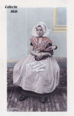 Meisje met pop in Arnemuidse klederdracht op nieuwjaarsdag.